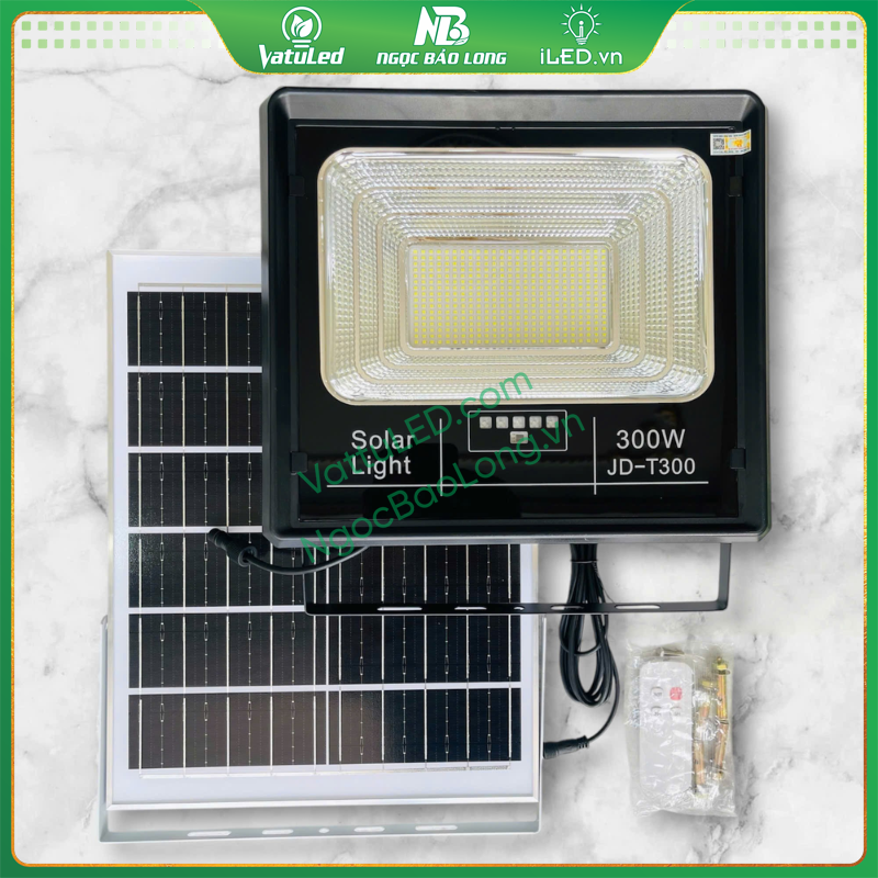 - Đèn pha năng lượng mặt trời JD-T300 300W được đi kèm bộ phụ kiện đầy đủ gồm: khung chữ U, ốc vít, dây kết nối và remote điều khiển, giúp việc lắp đặt trở nên đơn giản, nhanh chóng mà không cần đến kỹ thuật viên chuyên nghiệp.